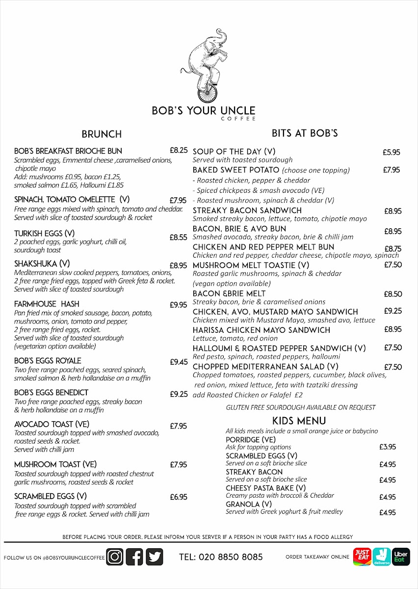 At Bob's Your Uncle, the menu feels thoughtfully curated, bringing together comforting breakfast staples, indulgent bakery treats, and a few unexpected savory highlights. Dishes like Shakshuka and Scrambled Eggs anchor the breakfast offering with warmth and familiarity, while Avocado Toast and Mushroom Toast with Poached Eggs add a modern, well-balanced touch that suits both light eaters and those looking for something more substantial. The bakery selection stands out as a real strength: Breakfast Almond Cappuccino Cinnamon Walnut Bun Chocolate Danish, Chocolate Danish Croissant, Banoffee Bun, Roasted Pepper Bun, Coffee Cake, Red Velvet Cake, Pasteis da Nata, along with classic Muffin and Bakery items, showcase a clear focus on flavor, texture, and visual appeal, making the counter hard to resist. For heartier options, the Pastrami Sandwich provides a satisfying savory contrast, while the inclusion of Octopus hints at a more adventurous side to the kitchen. Drinks are well-matched to the food, with Iced Coffee, Cortado, and other coffee choices pairing naturally with both sweet and savory items. Overall, the menu feels cohesive rather than overwhelming, balancing comfort, indulgence, and creativity, and leaving a clear impression of a place that understands how to deliver variety without losing its identity.